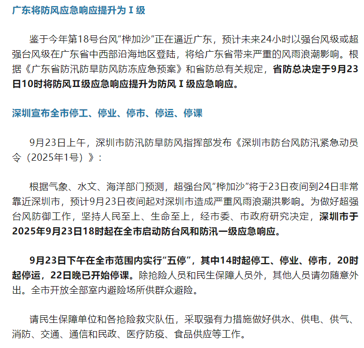 据人民网等媒体报道仁信,9月24日,今年第18号台风“桦加沙”(超强台风级)登陆广东,23日,广东深圳市发布包括停工在内的“五停”。