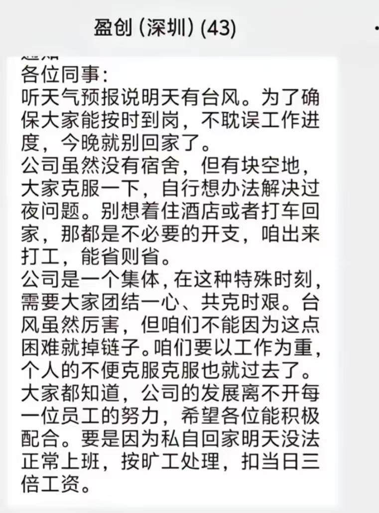 △网传有公司在台风期间不让员工回家,有关部门表示会尽快核实。图/网络