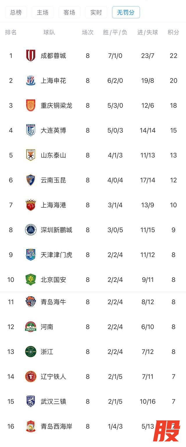 博远策略 中超8轮过后“无罚分”积分榜:蓉城领跑,申花第二,泰山第五